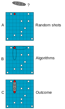 روش مونت کارلو را میتوان به بازی نبرد کشتیها تشبیه کرد. ابتدا یکی از بازیکنان شلیکهای تصادفی را انجام میدهد. سپس بازیکن از الگوریتم استفاده میکند (مثلاً یک کشتی جنگی به فاصله چهار خانه در جهت عمودی یا افقی قرار گرفتهاست). در نهایت بر اساس خروجی نمونههای تصادفی و الگوریتم، بازیگر میتواند محل های احتمالی کشتیهای جنگی بازیکن مقابل را حدس بزند.