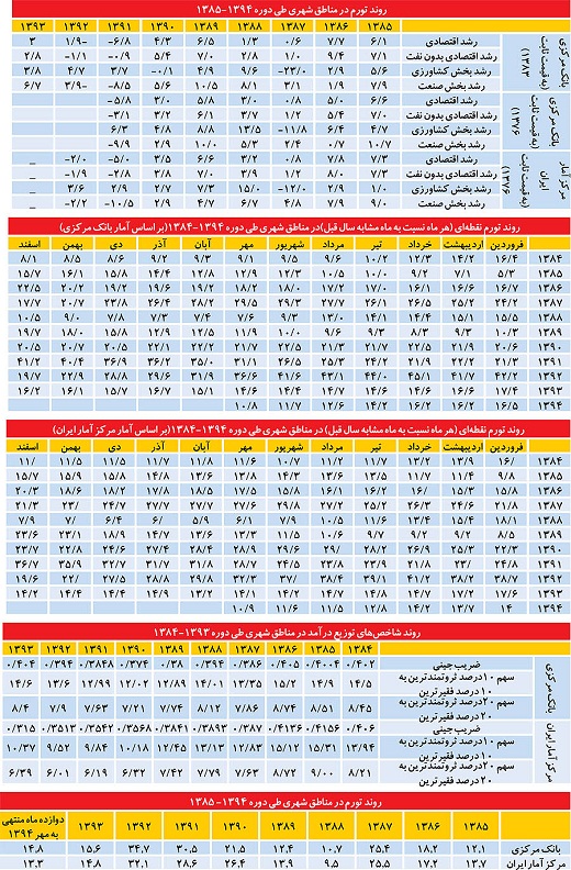 بر اساس آمار مرکز آمار ايران، تورم نقطهاي در اسفند 1391 معادل 7/36 درصد و در اسفند سال 1392 معادل 6/19درصد بوده است. همچنين بر اساس آمار بانک مرکزي، تورم در دوازده ماه منتهي به اسفندماه سال 1392 معادل 7/34 درصد و در سال 1393 معادل 6/15 درصد بوده و بر اساس آمار مركز آمار ايران نرخ تورم مناطق شهري کشور در سال 1392 معادل 1/32 درصد و در سال 1393 معادل 8/14 درصد اعلام شده است. به نظر ميرسد دو نهاد بانک مرکزي و مرکز آمار ايران در محاسبه شاخص بهاي کالاها و خدمات مصرفي از تئوري و الگوي يکساني پيروي ميکنند و بنابراین تفاوت موجود ميان نرخ تورم اعلامي از سوي بانک مرکزي و مرکز آمار ايران به عوامل ديگري نظير تفاوت در روشهاي نمونهگيري، پوشش جغرافيايي متفاوت نمونهها و قيمتگيري، پوشش زماني قيمتگيريها و نيز ضرايب اهميت مورد استفاده در محاسبه شاخص مرتبط است.